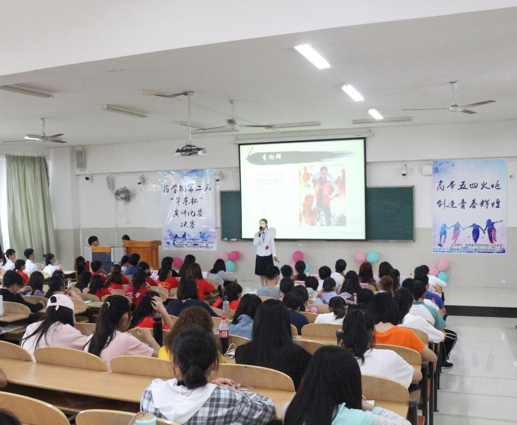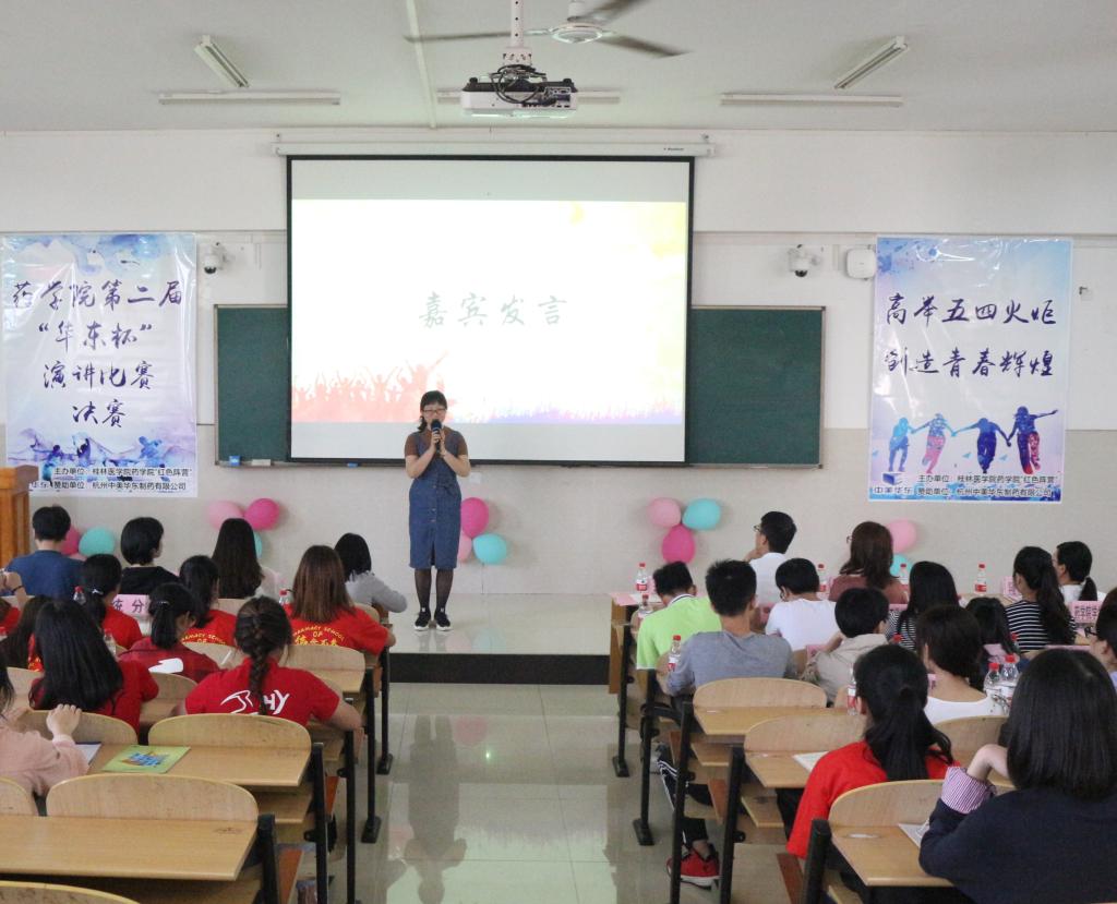 活动开始,首先由药学院学工办主任蒋艳平老师致辞,她希望通过纪念五四系列活动激发大学生的爱国热情,挥洒青春与热血,在演讲平台中展示出青年学子的崇高理想追求,随后,杭州中美华东制药有限公司桂林大区消化产品推广部经理张琨发言,他肯定了校企双方交流合作的积极作用,期待桂医学子展现出爱国的青春风貌。本次演讲比赛由选手自我简介和命题演说两部分组成,参赛选手围绕“弘扬五四精神,争做时代先锋”为主题开展演讲,他们回顾历史,立足当下,展望未来,结合实际,用慷慨激昂的演讲表达出青年学子青春心向党、建功新时代的奋进姿态,深深感染了在场观众。