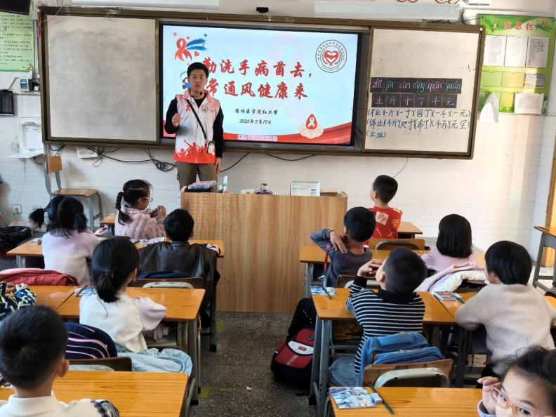 2025年3月18日,为弘扬雷锋精神,传递健康生活的理念,桂林医学院红丝带志愿者服务队走进致远小学,为学生们带来了一场以“勤洗手病菌去,常通风健康来”为主题的卫生健康知识宣讲活动,旨在增强学生们的健康防护意识。