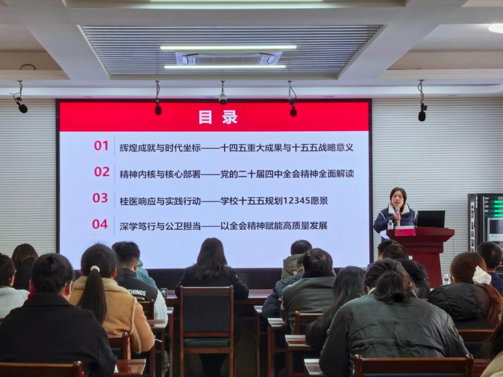 1月7日下午,学习贯彻党的二十届四中全会精神桂林医科大学宣讲报告会(公共卫生学院专场)在公共卫生学院217会议室顺利举行。校党委副书记、校长曾小云以“深学笃行党的二十届四中全会精神,聚力开创桂医发展新格局”为题作专题宣讲,公共卫生学院党政班子成员、全体教职工及学生代表参加学习。