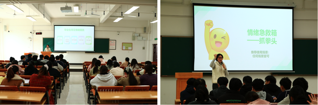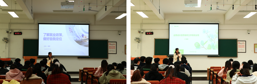 随后,葛静以“了解就业政策,做好自我定位”为主题,紧密结合当前就业形势,系统介绍了国家鼓励基层就业的多项政策,重点讲解了西部计划、选调生、“三支一扶”、参军入伍、特岗教师、新疆及西藏专项就业等项目的内容与报名条件。鼓励同学们积极投身基层,服务国家发展大局,把个人成长融入时代需要。引导同学们理性看待考研与就业过程中可能遇到的困难与挑战,以“我还在成长”的心态积极探索适合自己的职业方向,摒弃“一步到位”的完美主义,转而关注每一次面试、每一份实习所带来的经验积累,学会在尝试中调整、在反馈中进步。