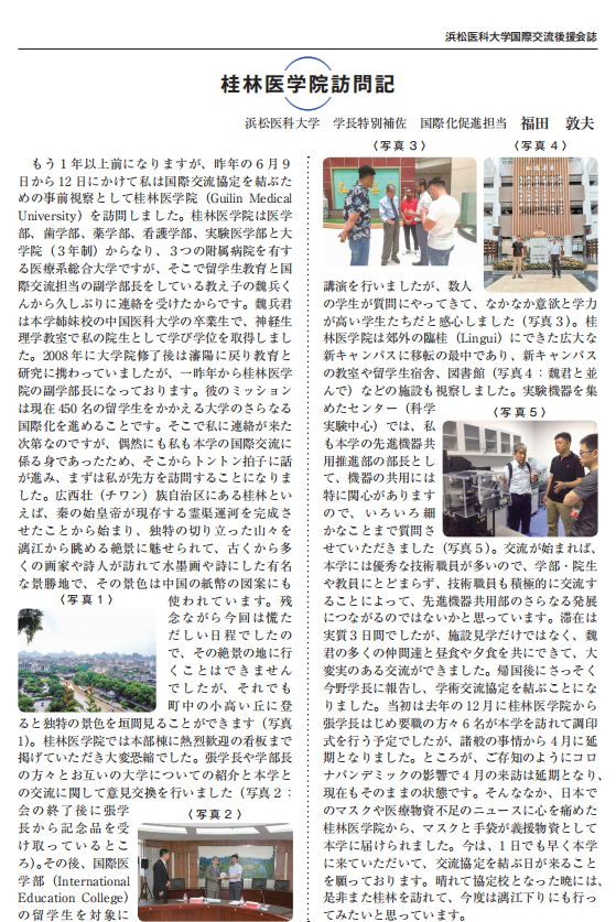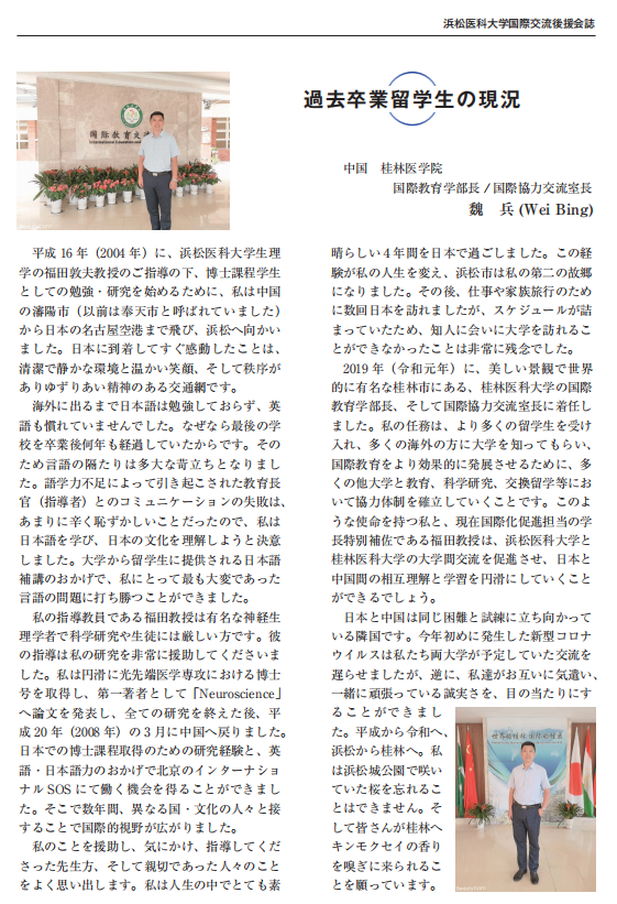 近日,我校收到浜松医科大学最新一期的《国际交流后援会》杂志,杂志以大篇幅讲述了去年6月福田敦夫教授访问我校以及今年上半年我校为该校捐赠防疫物资的事宜,表达了对我校的感激之情及与我校开展交流合作的期待之情。同时,杂志还首次推出“往届优秀毕业留学生现状”特别栏目,并将我校国际教育学院负责人魏兵作为首位封面人物进行了整版的专题报道,感谢他一直以来致力于为两校搭建沟通交流的平台,对他为联系两校所发挥的桥梁和纽带作用表示赞赏和肯定。