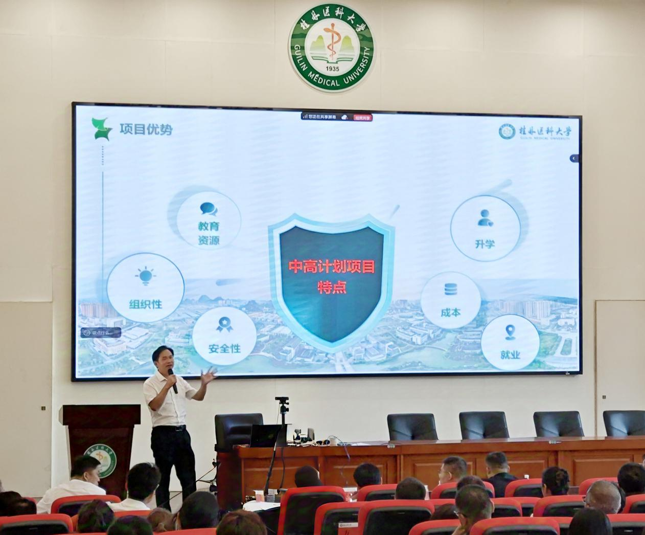 8月27日下午,我校在国际教育交流中心S101报告厅举行2025级“中高计划”项目班新生及家长见面会。校党委常委、副校长李清华,党委组织部部长韦日明,教务部、国际合作与交流处、检验与生物技术学院、康复医学系、药学院、人工智能医学院 、公共卫生学院、人文与管理学院主要负责人,澳大利亚麦考瑞大学、中高计划全国服务中心相关负责人,及2025级“中高计划”项目班新生及家长代表出席会议。会议采取线上线下同步方式进行,由国际合作与交流处负责人主持。