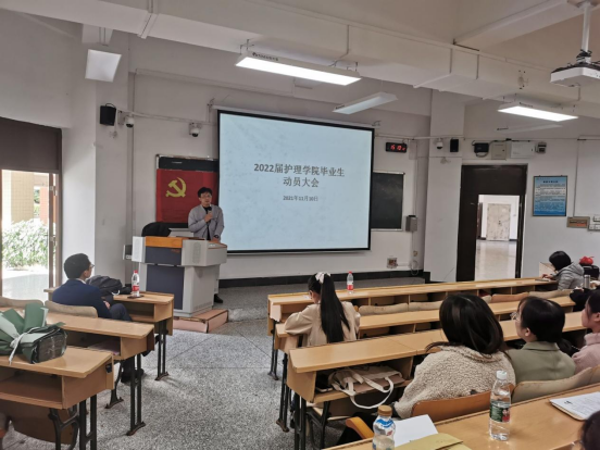为扎实推进2022届毕业生就业指导工作,帮助学生明晰就业形势,把握就业机会,11月10日下午,护理学院在东城校区T—2教室举行2022届毕业生就业动员大会。本次会议邀请护理学院党委副书记谢勇志、桂林医学院第二附属医院运营管理部劳颖谦主任到场指导,毕业班辅导员及全体毕业生参会。会议由李湘老师主持。
