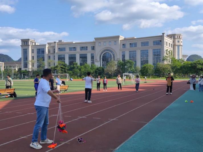 活动首先在临桂校区教学南楼S202教室举行,主持人向大家介绍活动主题、内容及意义,同时介绍了部分少数民族传统体育竞技项目的起源与竞技规则,激发了同学们对活动的热情和向往。随后,活动从室内转移到室外,师生移步到北运动场,共同体验板鞋竞速、抛绣球、跳长绳、丢沙包等多个具有少数民族传统特色的体育竞技活动,运动场上处处洋溢着热闹欢腾的景象。