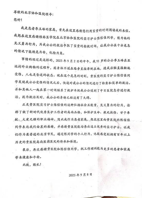 近日,两名北京市民来到北京协和医院赠送锦旗和感谢信,专程感谢来自桂林医学院护理学院的实习学生陈信佳,表扬他“弘扬社会正能量 见义勇为好榜样”的医者仁心、救死扶伤的大爱精神。