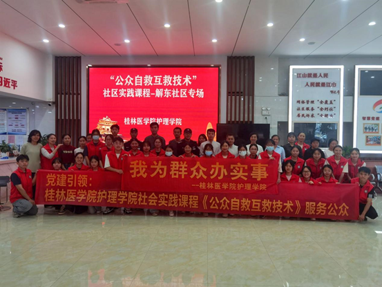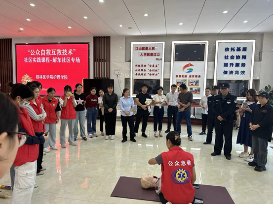 为增强社区居民应对突发性疾病和伤害事件的紧急救护知识,提升公众自救互救能力,2023年10月24日,桂林医学院护理学院何林炎及李爱娟老师受桂林市秀峰区解东社区邀请,带领学生们在桂林市秀峰区解东社区展开了“掌握黄金四分钟,守护生命‘救’在身边”的急救知识讲座与技能培训活动。