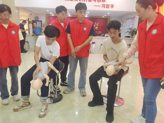 在实践操作环节,学生代表为在场的居民群众演示了心肺复苏的急救流程与操作要领。随后,社区居民使用模拟人进行心肺复苏与海姆立克急救术练习。学生在老师的引导下,对社区居民进行一对一操作指导,及时纠正不规范的动作,使居民正确掌握的急救操作。