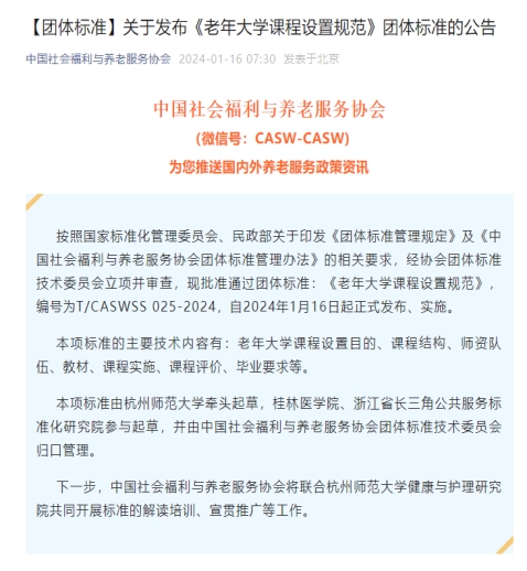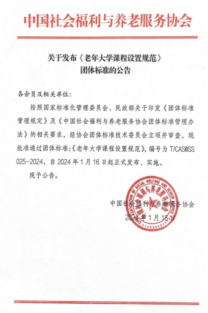 据悉,民政部、中国社会福利与养老服务协会将联合标准起草单位共同开展标准的解读培训、宣贯推广等工作,由此以标准化建设为引领,带动全国老年教育事业取得新进展、新成效。