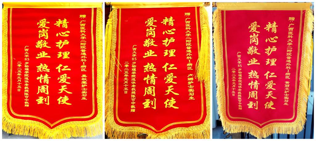 在第114个国际护士节到来前夕,护理学院在广西医科大学第二附属医院普外一病区的2023级护理学(专升本)班实习生吴秋莹、卢娜、黄丽文分别收到了一份特殊的“节日礼物”:85岁高龄的广西大学物理学院退休教授陈可中老先生在治疗康复出院之际,将绣有“精心护理、仁爱天使、爱岗敬业、热情周到”的锦旗郑重送到她们手中,深情感谢这三名“00后”实习生在其住院期间的精心照护。这面锦旗不仅承载着患者家庭的诚挚谢意,也见证了新时代护理人的责任与担当,更是对学院“三全育人”教育成效的充分认可。