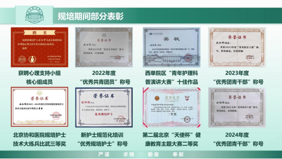 此外,他还注重持续夯实护理素养,参与护理技术练兵比武大赛荣获三等奖,并作为优秀规培护士代表在2022级规培护士结业仪式上,分享两年规培的收获与成长。持续深化科研学习,参与发表论文3篇、参编教材1部。持续提升科普能力,参加北京第二届“天使杯”青年护士健康教育主题大赛获二等奖,并受邀参加北京卫视“有你·就有光”2024年5.12国际护士节专题节目录制;参与北京协和医院西单院区“青年护理科普演讲大赛”,作品获十佳作品。持续强化专科服务,作为北京协和医院心理支持专科小组成员,参与稿件制作与推送,累计制作稿件超100期,访问量超2万人次,坚持用声音传递正能量,用声音化解他人心中阴霾。