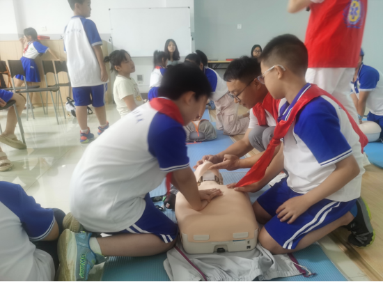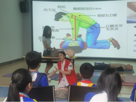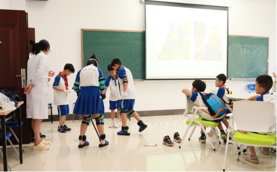活动中,师生及家长来到南丁格尔展馆,在工作人员讲解下,系统了解护理学的发展历程,深刻感悟“提灯女神”南丁格尔无私奉献的职业精神,引导孩子们树立责任心与爱心意识;在小儿肥胖科普讲座中,了解儿童肥胖的危害性,学习如何科学饮食对儿童发育更健康;在“当我老了”沉浸式体验活动中,孩子们佩戴老花镜、穿戴关节束缚装备,切身感受老年人视力模糊、行动不便的生理变化;在“听听我的心跳”互动中学习触摸脉搏、感知生命节律,进一步深化尊老爱老情怀;在急救科普馆内,观看各种急救设备及急救知识展报,并进行心肺复苏术(CPR)、海姆立克急救法及溺水急救的技能培训。在心肺复苏环节,利用急救虚拟仿真系统进行培训,邀请家长与孩子组队参与模拟演练,通过虚拟系统+“手把手”指导确保掌握按压部位、深度、频率等核心要领,家长及孩子们纷纷表示这样的科普非常实用、有意义,不仅让知识在家庭中传递,学会了保护自己和帮助别人的本领,更在孩子心中种下敬畏生命、互助互爱的种子。