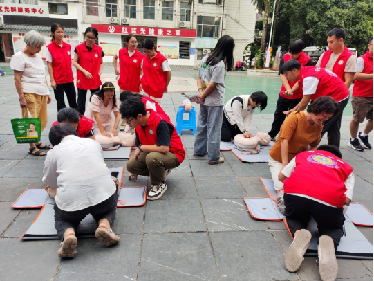实操教学环节,让急救技能“活”起来。学生志愿者借助人体模型,详细演示心肺复苏的按压位置、频率与深度,并讲解成人、儿童及婴儿气管异物急救法的区别。学生助教配合教师展示AED的开机、电极片粘贴、放电除颤等操作流程。参训的高校学生与社区居民认真观摩、积极练习,动作由生疏逐渐转为规范流畅,应对突发状况的信心显著增强。