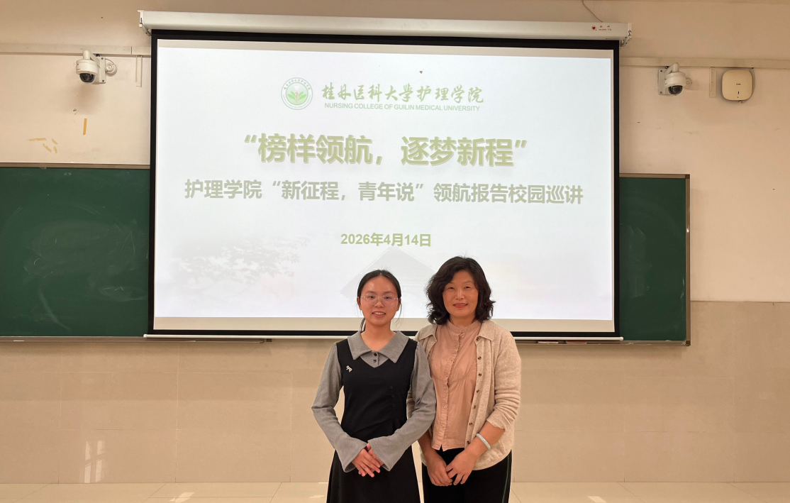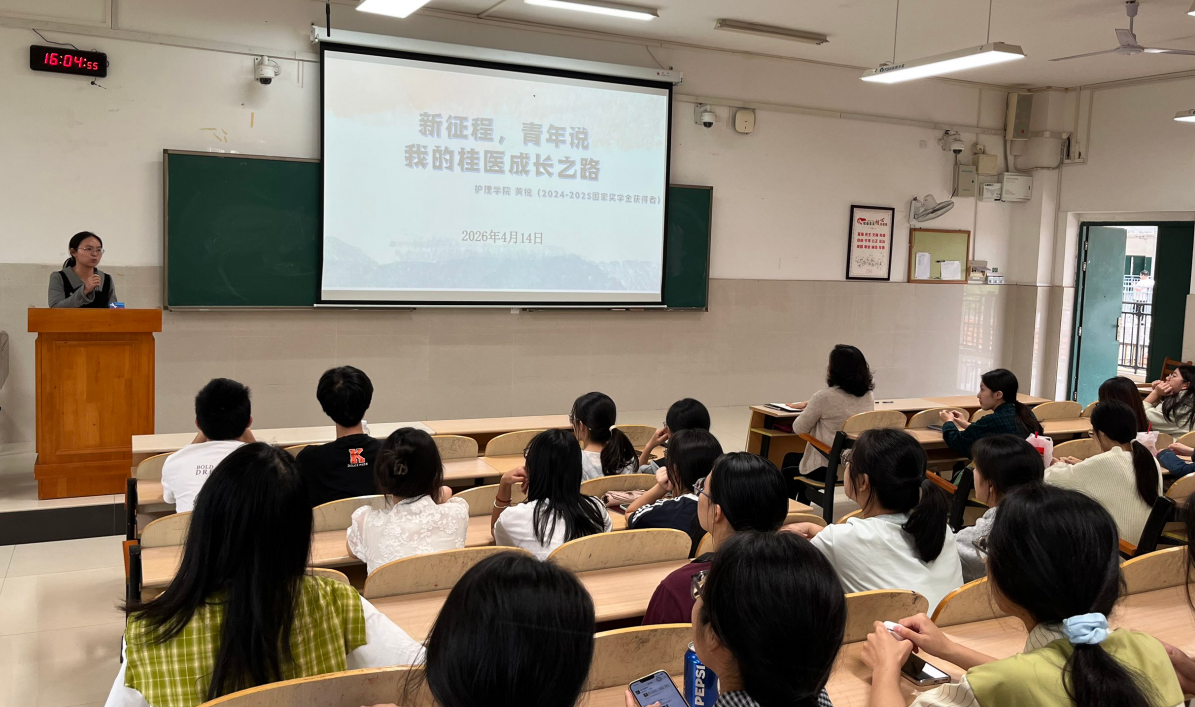 为发挥先进典型示范引领作用,营造优良学风,4月14日,护理学院在临桂校区崇德南楼301教室顺利举办2026年“新征程,青年说”领航报告校园巡讲活动。学院学工办主任王玲珍及2025级护理学生代表近200名师生现场聆听,与榜样面对面交流,共话青春成长。