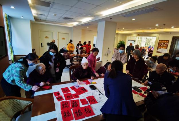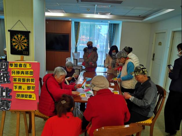 一走进养老公寓的大门,志愿者们便有序忙碌起来,组织老人们开展猜谜语、套圈圈、剪窗花、吹乒乓球、写福字等活动。有的老人兴致高涨,纷纷在猜谜语、套圈圈和吹乒乓球活动项目中亮出自己的“绝活”,获得优胜的奖励;有的老人手持剪刀,“精雕细刻”剪出精致美丽的窗花;有的老人挥毫泼墨,手握毛笔写下寓意满满的“福”字。他们还开心举起自己得意的作品让志愿者帮忙拍照留念,大家都沉浸在迎接新年的欢乐氛围中。
