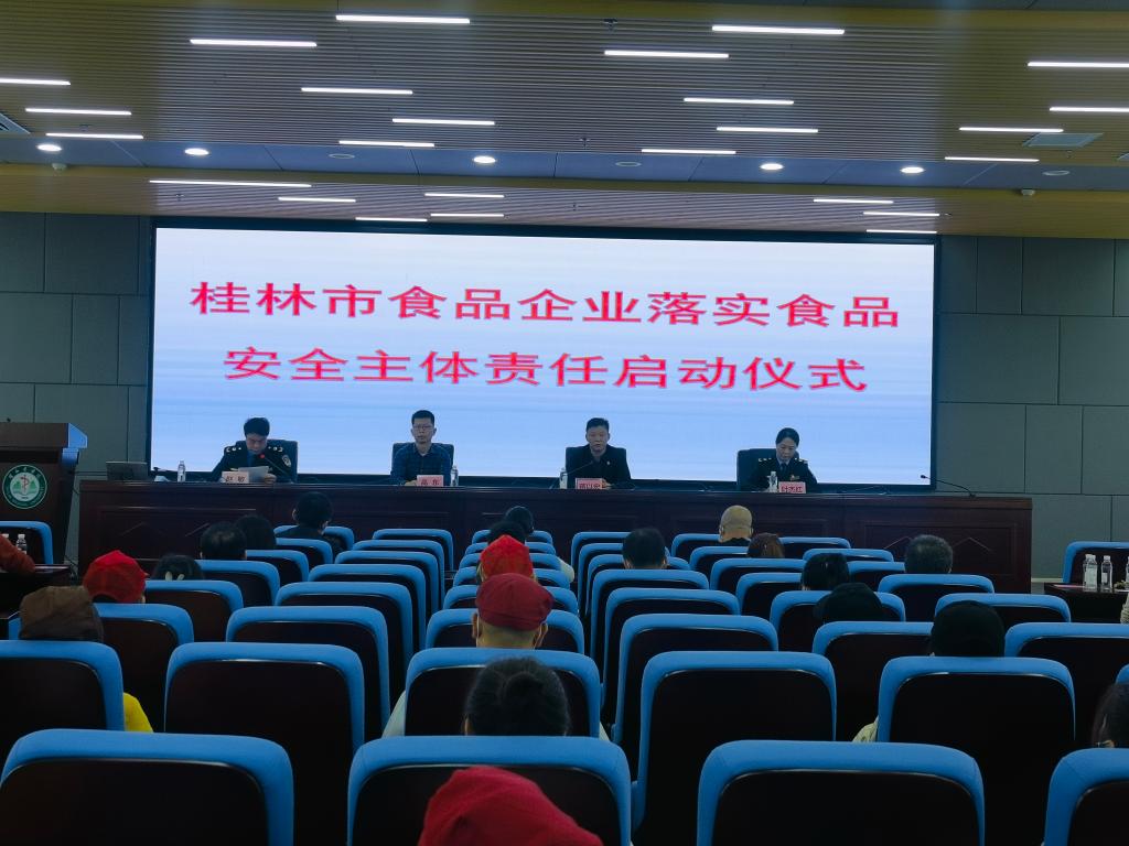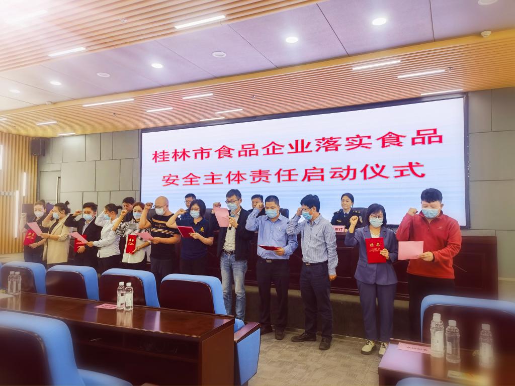 现场会首先在我校科学实验中心多功能报告厅举行桂林市企业落实食品安全主体责任行动的启动仪式。桂林市市场监督管理局副局长蒋以宏在启动仪式上指出企业主要对本企业食品安全工作负全责,要依法规配备食品安全总监,食品安全员;要认真落实好日管控、周排查、月调度。企业负责人现场颁发食品安全总监聘书,食品安全总监举行承诺宣誓。