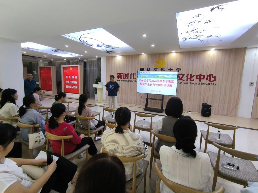 桂林医科大学即将迎来九十周年校庆,宿舍作为校园重要的生活场所,是展示学校形象的关键窗口,也是保障师生及来访嘉宾体验的核心阵地。为进一步提升宿舍管理队伍的专业素养与服务能力,以精细化、暖心化的管理服务迎接校庆,营造安全、整洁、温馨的校园住宿环境,近日,后勤基建处在临桂校区新时代大学生党建文化中心举办桂林医科大学2025年秋季学期迎校庆宿管员培训。