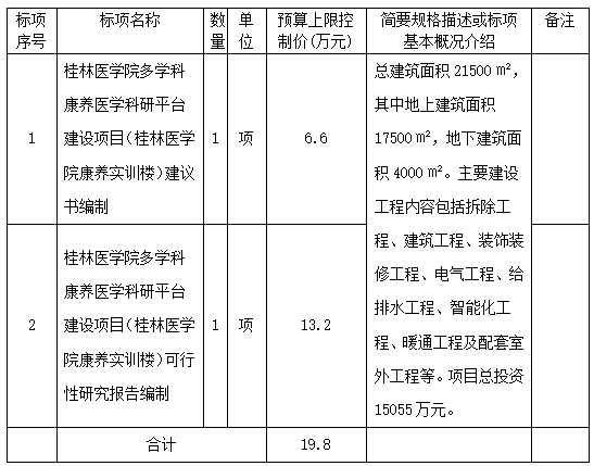 项目名称:桂林医学院多学科康养医学科研平台建设项目(桂林医学院康养实训楼)建议书、可行性研究报告编制项目预算上限控制价:19.8万元