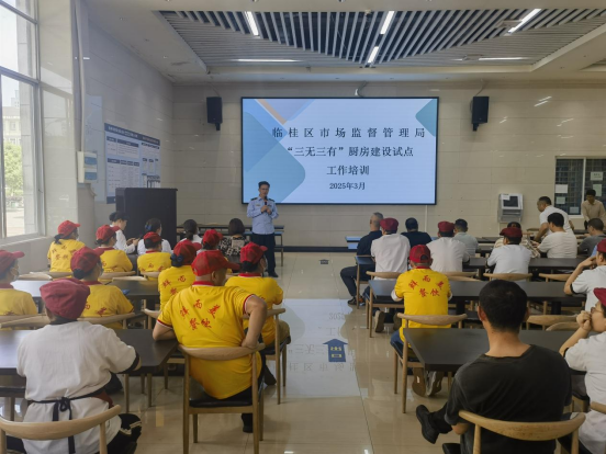 首先由桂林市临桂区市场监督管理局梁伟军副局长做《临桂区市监局“三无三有”厨房建设试点工作培训》,指导校园食堂后厨的卫生管理,要求从业人员严守操作规范,保障广大师生的食品安全。