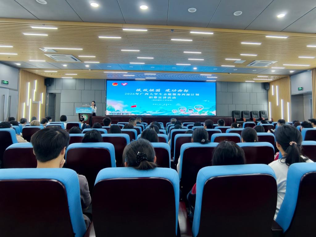 4月14日,2026年广西大学生志愿服务西部计划招募宣讲会在我校举行。西部计划广西项目办、广西大学生志愿服务西部计划宣讲团,我校学生工作部(处)、团委相关负责人,各学院分管学生工作领导、团委书记、毕业班辅导员及2026届毕业生代表等,共计1200余人通过线上线下的方式,共同聆听那些奔赴山海、扎根泥土的青春故事。