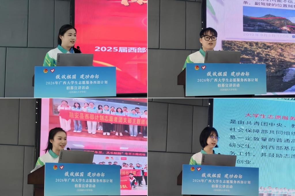 宣讲会上,三位扎根基层的志愿者代表分享基层服务经历。在南宁市隆安县第三中学支教的陈单睿,用一个个温暖瞬间分享了自己在乡村教育一线的支教故事。扎根来宾市忻城县的李政锋,则结合多年基层服务经验,分享了从校园学子到基层工作者的成长蜕变。在柳州市融安县泗顶镇服务的严宇田,则分享了她将播音主持专业与AI宣传、助农直播相结合,为乡村发展注入新活力的故事。西部计划广西项目办专员赵英琪解读2026年招募政策,详解项目背景、流程、保障及发展路径。互动环节,现场的师生围绕报名条件、岗位要求等问题踊跃提问,宣讲团逐一解答。