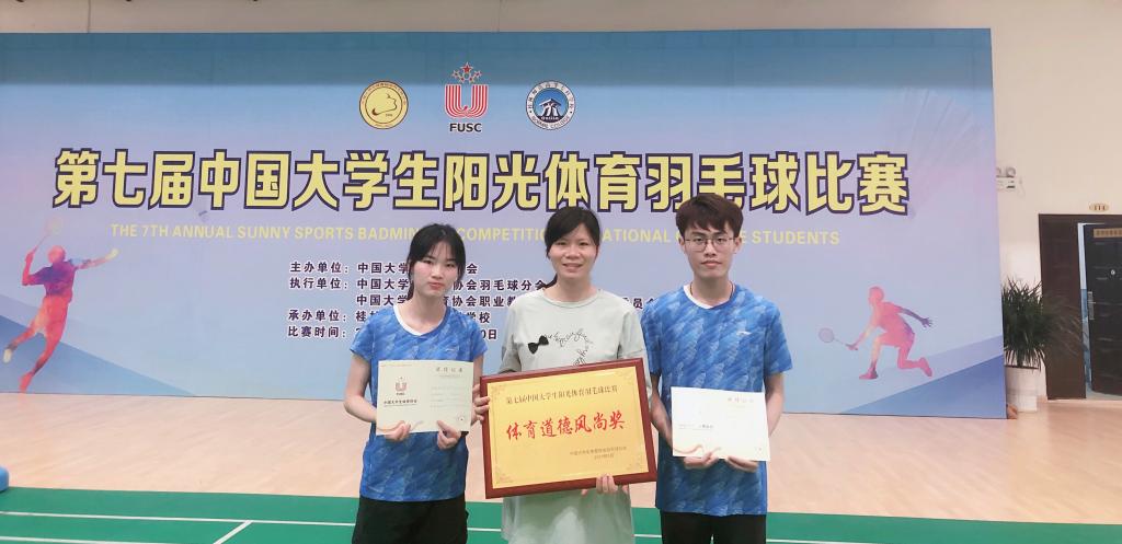 我校羽毛球队选派男、女各5名运动员参加比赛。比赛中,男女混双运动员梁凯奇、黄蘭岚团结协作,顽强拼搏,经过激烈角逐最终取得了该项比赛第五名的好成绩;男、女团体、男子单打、双打项目皆闯进十六强,较去年的参赛战况取得了较大的突破。