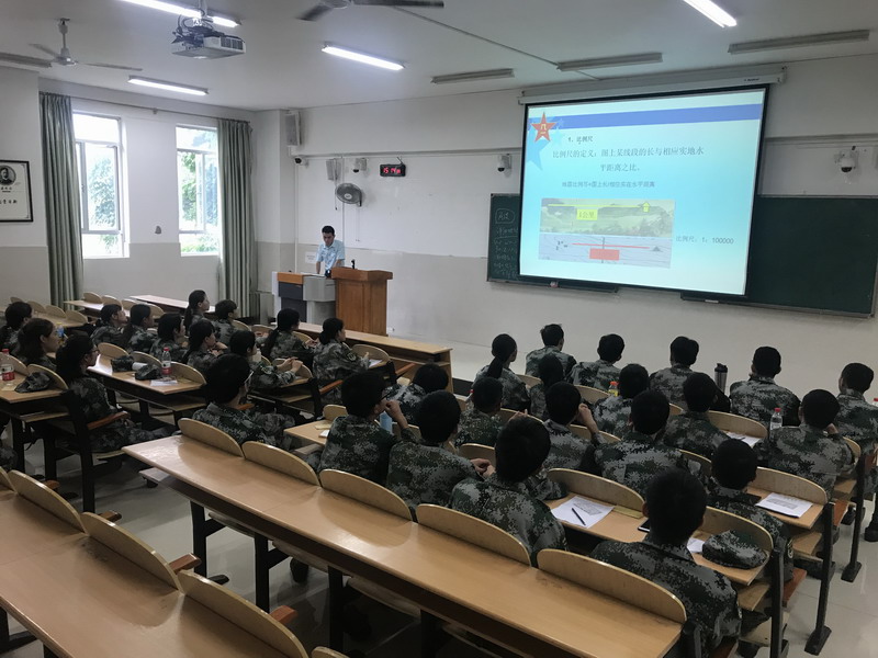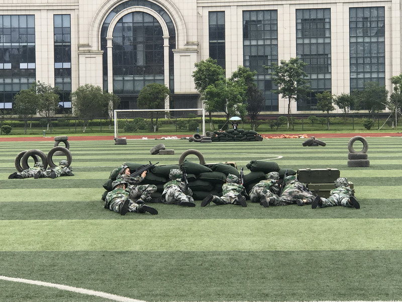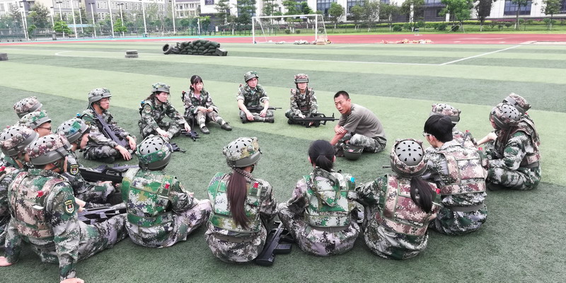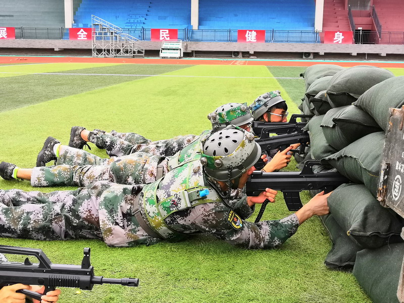 武装部从学校转业退伍军人中遴选出专业对口、军事素质较强的人员进行训练课目教学,内容有:轻武器射击理论、95模拟步枪射击、战术基础、单兵战术动作、战场医疗救护、识图用图、核生化防护、班组模拟对抗、步兵班防守阵地战斗组等训练课目。7月14日在实地见学活动中,参观了我军现役新型战斗机。