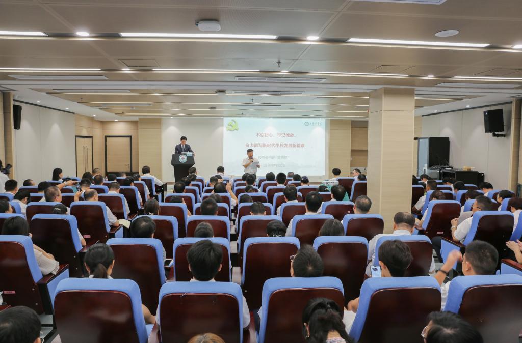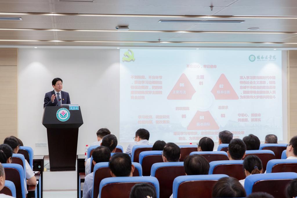 为深入贯彻党的十九大精神,提高党员政治素质,进一步坚定理想信念,按照中央和自治区开展“不忘初心、牢记使命”主题教育的部署要求,9月20日上午,桂林医学院党委书记黄照权在第二附属医院讲授题为《不忘初心、牢记使命,奋力谱写新时代学校发展新篇章》的首场专题党课。第二附属医院在院党政领导班子及全体中层、党员干部等140余人聆听了专题党课。