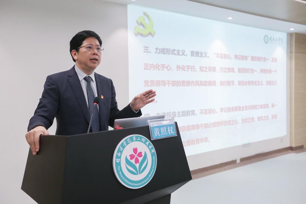 黄照权围绕学习习近平新时代中国特色社会主义思想特别是以人民为中心的思想和学习习近平总书记关于“不忘初心、牢记使命”的一系列重要论述,深刻阐述了开展主题教育的重大意义,阐明了主题教育的目标要求和重点措施,通过讲清存在的差距不足,讲清指导实践、推进改进工作的思路举措,讲清悟初心、担使命的感悟,让在场的党员干部对此次主题学习有了更全面的了解。他指出,党员干部要以初心使命践行大医精诚,用实际行动诠释医者仁心,助推第二附属医院迈上新的台阶,以优异成绩庆祝中华人民共和国成立70周年。