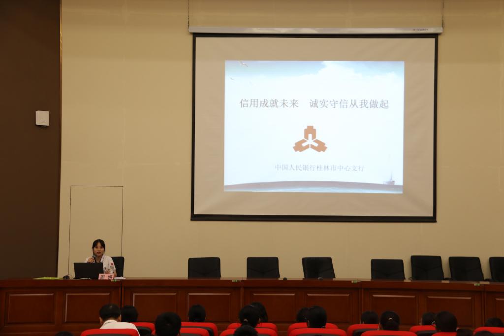 中国人民银行桂林市中心支行业务员周妍为生物技术学院2019级全体新同学做了以“信用成就未来,诚实守信从我做起”为主题的征信知识普及和诚信教育宣讲。