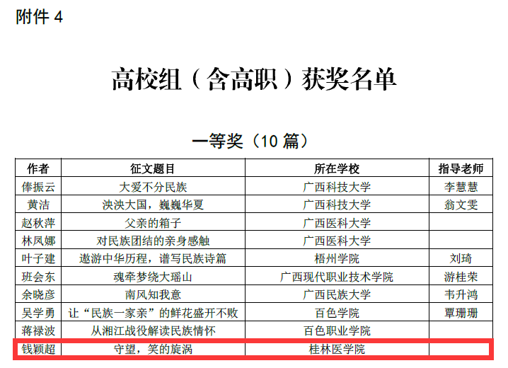 根据《自治区教育厅关于公布“喜迎新中国成立70周年 共话民族团结进步教育”征文活动评选结果的通知》(桂教民教〔2019〕11号),我校选送的2018级基础学硕班钱颖超的作品《守望,笑的旋涡》荣获高校组(含高职)一等奖。