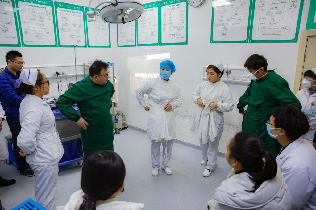 武汉已有成功应用体外膜肺氧合技术(ECMO)成功救治新型冠状病毒肺炎重症患者的先例,第二附属医院重症医学科作为ECMO的管理和使用科室,是医院治疗该病患者的最后一道防线。自接到防控任务以来,科室进行了“新型冠状病毒肺炎医院感染防控注意事项”,“新型冠状病毒肺炎院内消毒隔离防控措施”,“防护服穿脱方法”、“医务人员职业防护用品的使用”等一系列有针对性的培训和学习。