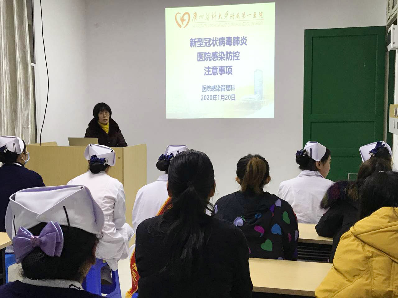 医院感染控制科1月15日参加完全区新型冠状病毒感染的肺炎防控工作电视电话会议暨全国新型冠状病毒感染的肺炎医疗救治工作视频培训会后,于1月16日下午组织全院医务人员开展新型冠状病毒肺炎防控措施培训;于2020年1月21日上午在院领导的带领下对门诊预检分诊、发热门诊、急诊预检分诊、感染性疾病科等医务人员的职业防控措施落实情况进行督查,发现问题及时整改;于1月22日参与了发热病人、疑似感染病人诊治流程应急演练;22日下午感控科对重点科室医务人员职业防护用品使用情况进行督查;根据国家卫生健康委员会下发的新的新型冠状病毒感染指南,于1月23日下午对全院医务人员再次进行针对该疾病的防控、消毒培训,并请感染性疾病科护士长示范医务人员职业防护用品的使用和穿脱。