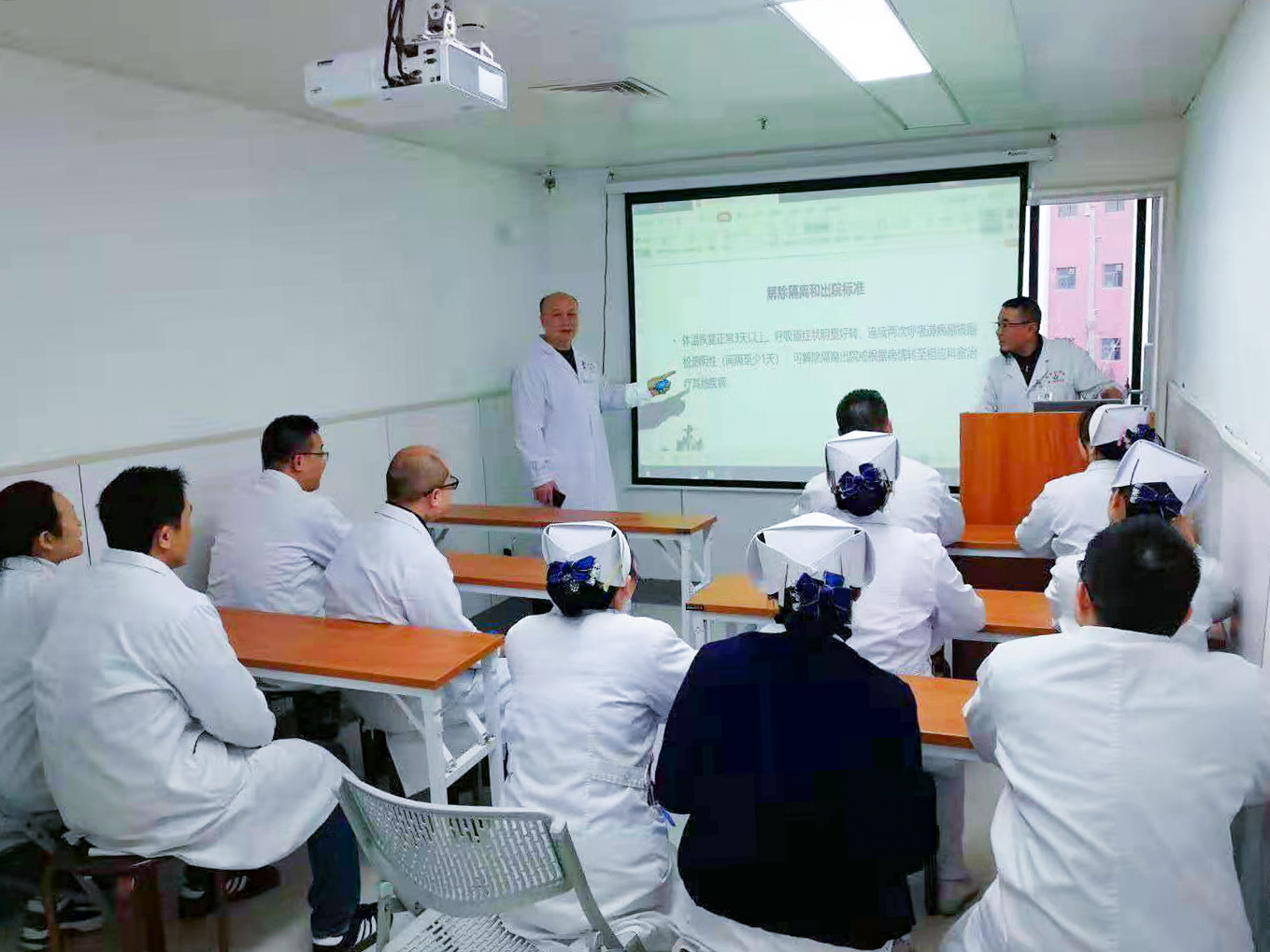由呼吸与危重症医学科、心胸血管外科、感染性疾病科、肿瘤科、放射科组成的胸部疾病多专科协作组(MDT)利用多科协作业务学习时间,针对医护人员进行了两次新型冠状病毒肺炎防治知识的培训,对“武汉新型冠状病毒肺炎的诊治”、“武汉新型冠状病毒肺炎的流行病学特点和防控”、“病毒性肺炎的CT下诊断及鉴别诊断”、“冠状病毒肺炎的诊治新进展”、“武汉新型冠状病毒肺炎的流行病学特点和医务人员防控新进展”和“冠状病毒性肺炎的影像学特点”等问题进行了深入的学习和探讨。