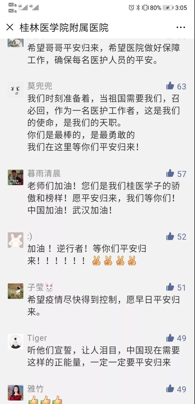 对此,桂医附院医疗队队长卢青代表医疗队向广大桂林市民及网友表示感谢!有大家的鼓劲加油,有医院的坚强后盾保障,我们将不辱使命,坚决完成任务,平安归来。