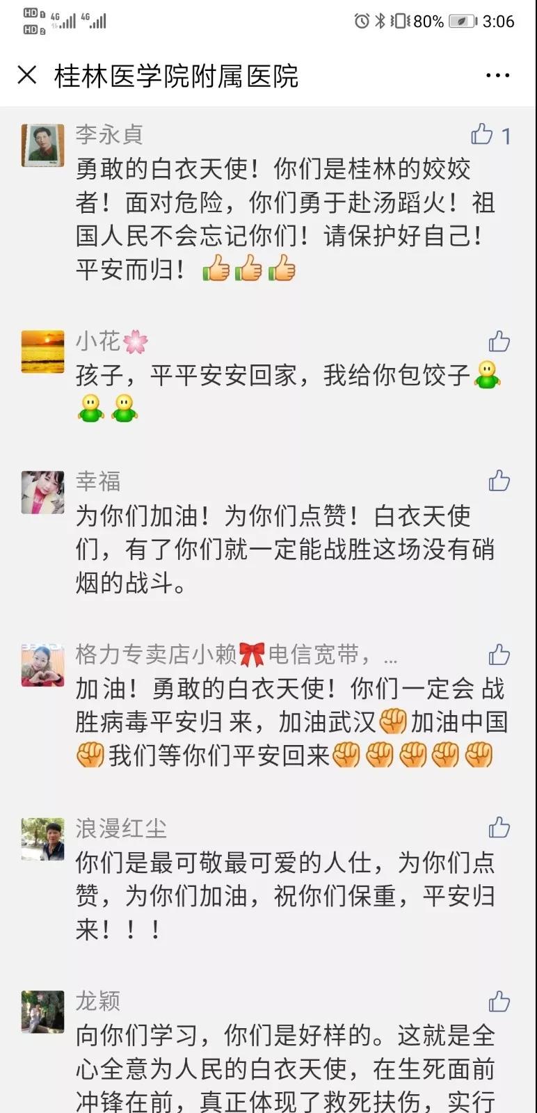 1月27日,许多市民看完桂医附院微信公众号推出的《出征| 桂林首批医疗队驰援武汉!》消息以及近20家媒体聚焦报道后,纷纷留言祝福,为最美“逆行者”鼓劲加油。