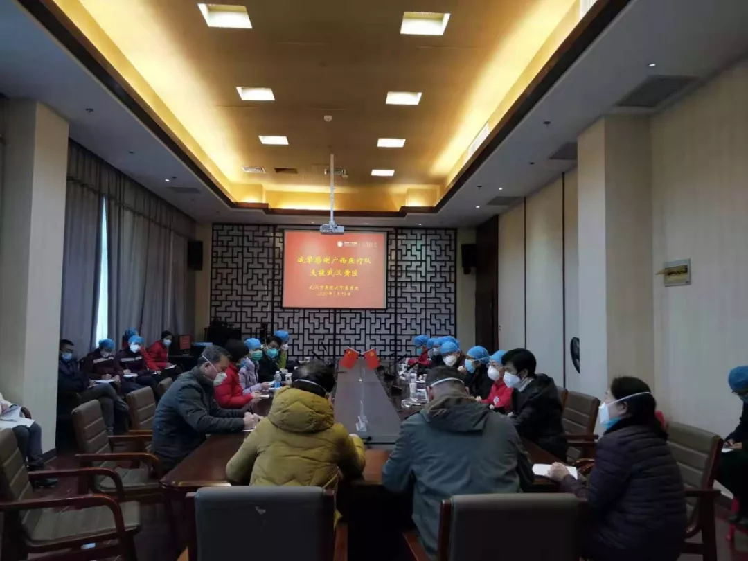 28日上午,广西支援湖北医疗队召集广西13家医院队长和各组组长召开会议,及时与当地卫健委、黄陂中医院进行对接,了解疫情防控形式。为了有效的开展工作,医疗队成立了医疗组,护理组、感控组、物资组,分别由医疗队各医院小组抽调人员组成,具体负责相关工作,第二附属医院领队林云主任任武汉黄陂区中医医院十一楼病区医疗负责人(主持工作)。医疗队将医护人员进行了分组,分为普通救治组和危重症组。
