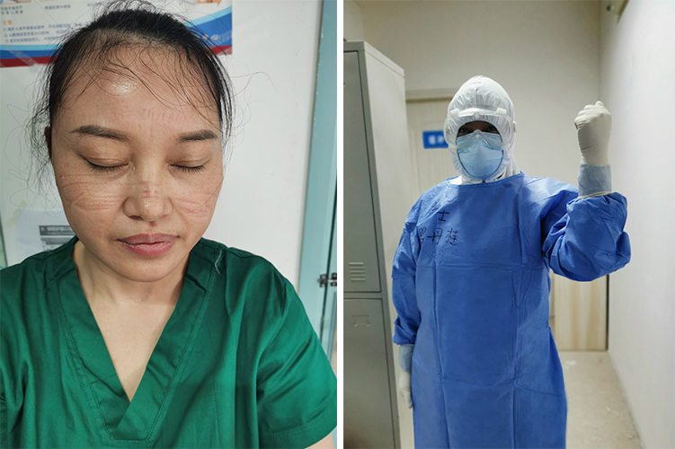 “根据工作分配,我们的主战场在黄陂区中医院,一家三甲医院。我是首批进入隔离病区工作的医生,说实话,踏进病房的那一刻,真的很激动。”第二附属医院医疗队队长林云副教授说到。1月29日,按照安排普通组医疗队队员进入医院隔离病房工作,林云副教授和银建华医师换上了防护服,成为广西医疗队首批进入隔离病区工作的医生。29日晚,为了降低风险,当日进入病区的工作人员回到酒店自行隔离,通过微信语音为大家做工作经验分享。林云拍了一张自拍照,发到医疗队微信群,看着被防护面罩勒出的深深痕迹和红肿的鼻梁,大家纷纷发出感慨和心疼。可林云却说:“没事,洗个热水澡,揉一揉就好了。”当晚,林云向广西医疗队负责人申请自愿连续三天进病房,为更好了解病人情况和熟悉环境。