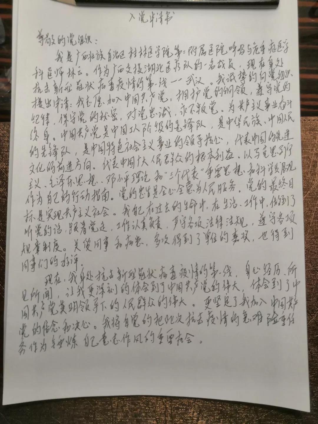1月31日晚上,刚结束一天工作的林云回到休息的酒店,虽然身心疲惫,但想着这些日子以来那些共产党员们冲锋在前、奋不顾身的身影,怎么也睡不着觉,翻身起来拿着酒店内的A4纸写下了入党申请书,要求火线入党,做好表率,带领队员们勇战疫情。随后,桂林医学院第二附属医院的另外8名医疗队员也纷纷写下了自己的入党申请书,向党和人民表达自己的赤诚之心。