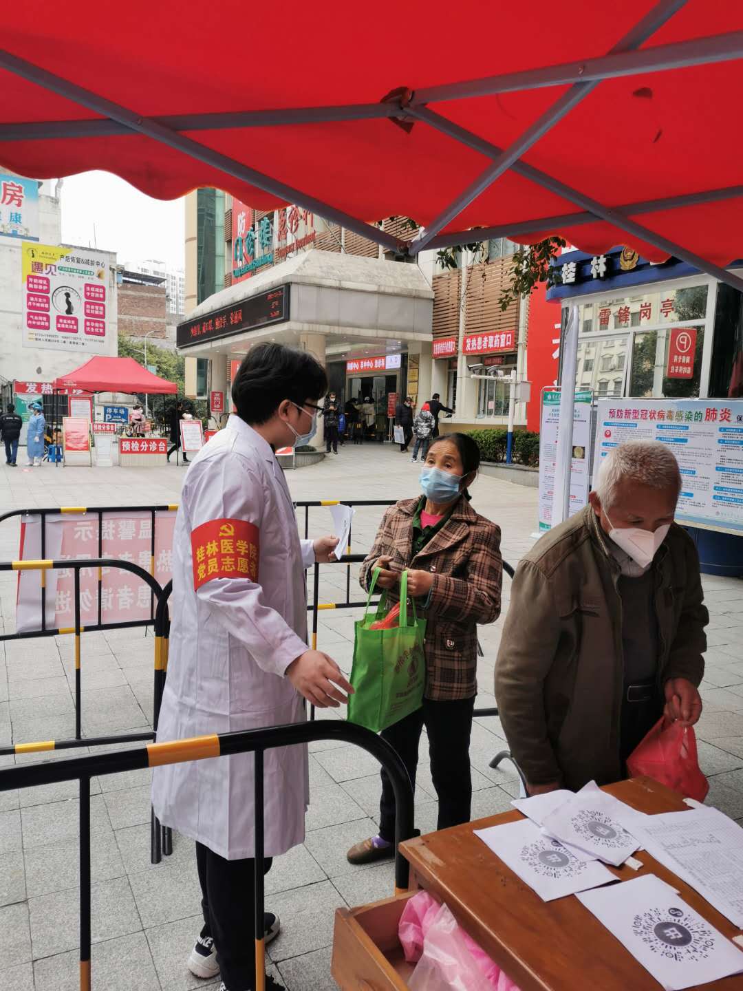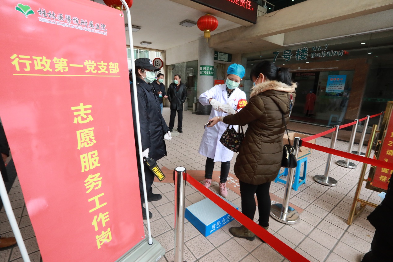 志愿者队伍在学校和各附属医院疫情防控指挥部的统一调度下,科学有序参与疫情防控工作。按照“安全第一、就近就便”的原则,志愿者分别进入乐群校区、东城校区、临桂校区、少爷塘小区、李子园家属区开展志愿服务,主要协助开展门岗执勤、进出人员的证件查验、体温检测、出入登记和疏导引导等工作。各附属医院党员志愿者同时在医院门诊大楼、放射科通道、住院大楼通道、发热门诊取药窗口等志愿点开展服务。