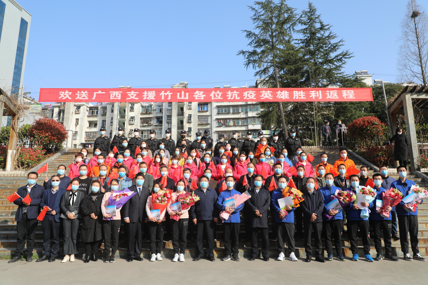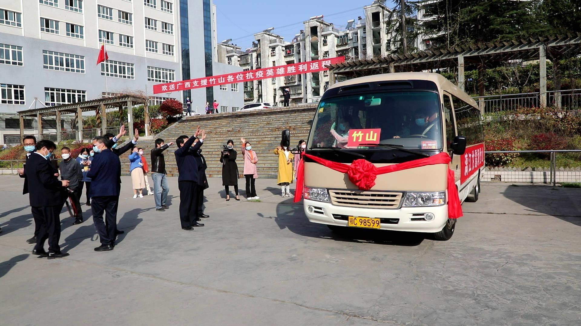 3月20日,桂医附院援竹医疗队9名医护人员完成援竹使命,启程回家。县领导到现场送行。