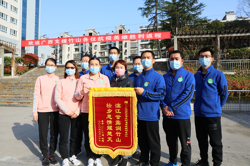 当天,竹山县人民医院最后一名出院的患者家属听说医疗队要回家了,专程赶来给桂医附院医疗队送上写着“漓江甘露润竹山、壮乡恩情耀楚天”字样的锦旗,队员深深感动。