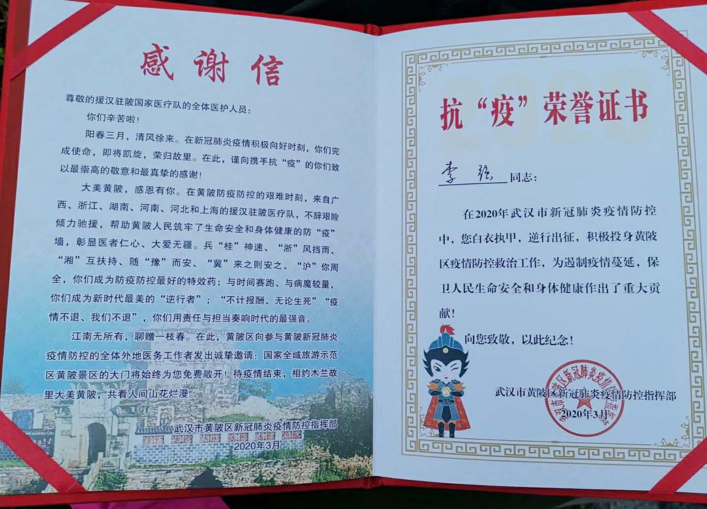 武汉黄陂区疫情防控指挥部颁发荣誉证书