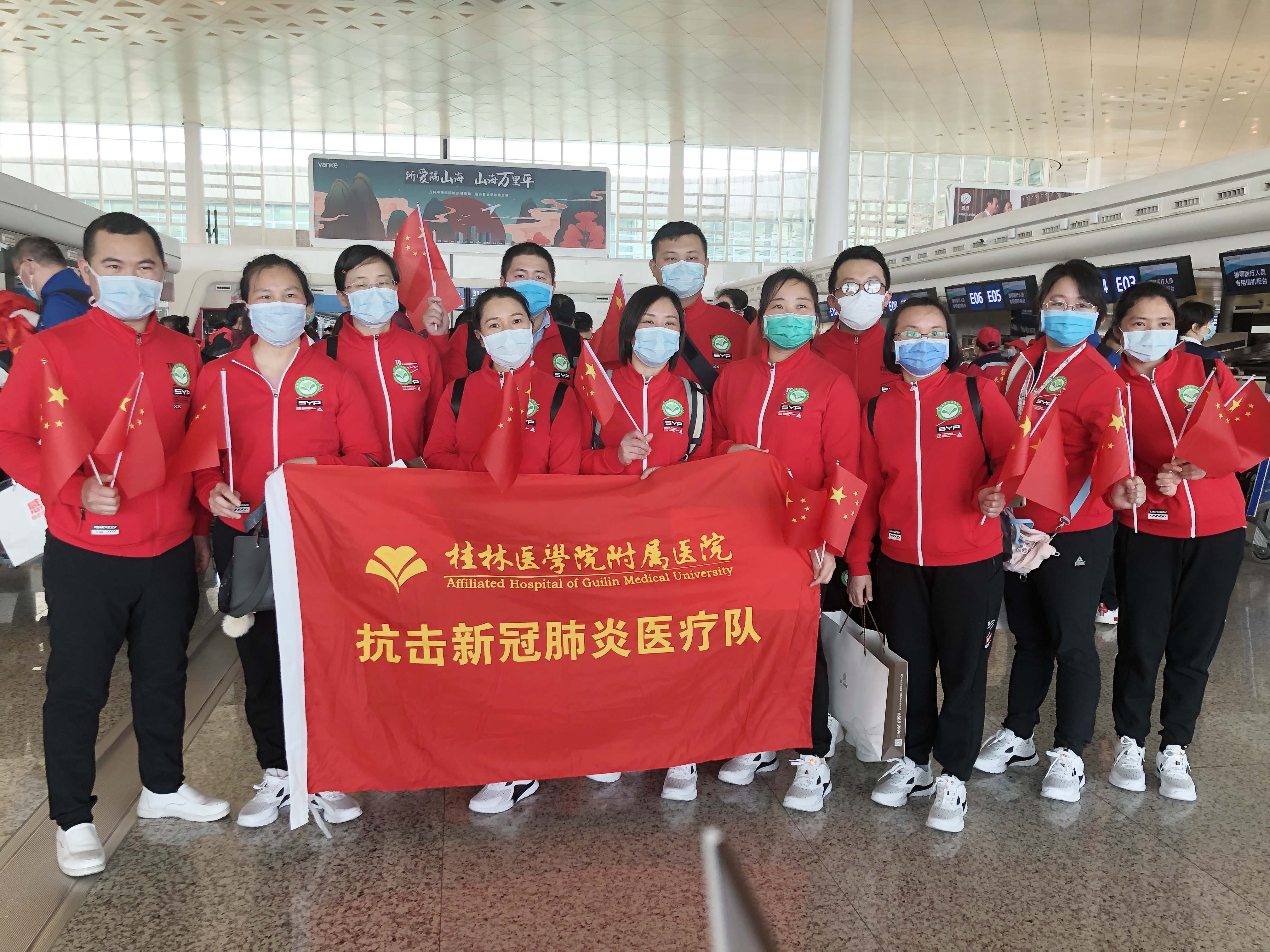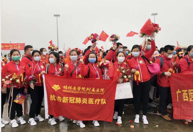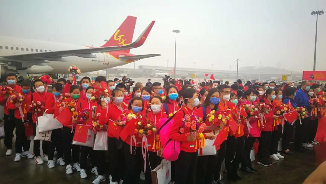 其中,包括桂林医学院附属医院首批医疗队12名英雄,按计划,返回南宁后,所有队员将集中隔离14天,再回桂林家乡!