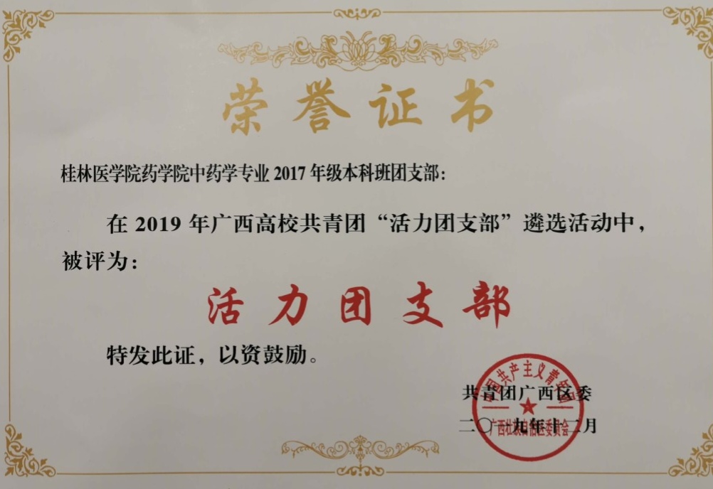 近日,共青团广西区委公布了2019年广西高校共青团“活力团支部”遴选结果,我校护理学院助产学专业2018级本科班团支部及药学院中药学专业2017级本科班团支部成功入选。