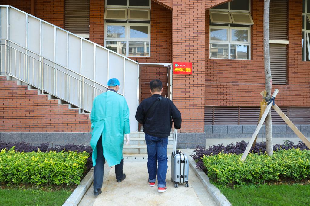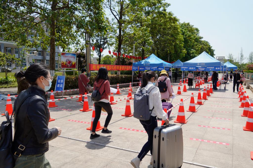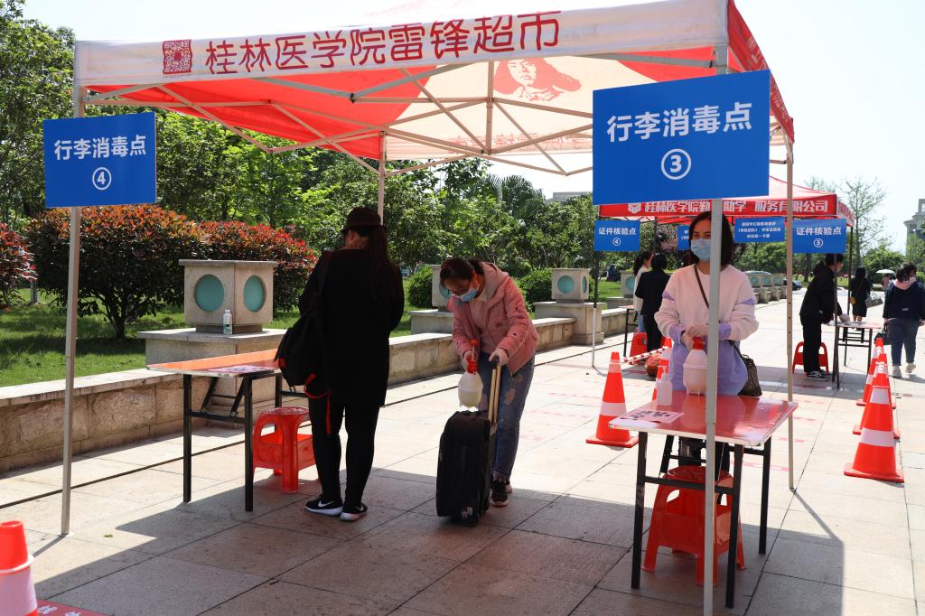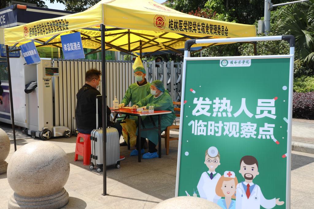 学生返校接待演练和学生发热处置演练学校临桂校区东大门,演练乘坐私家车、校车返校,“正常体温学生”、“证件携带不齐学生”、“体温检测异常学生”、“通道消杀”、“隔离点消杀”等不同情况处置流程。