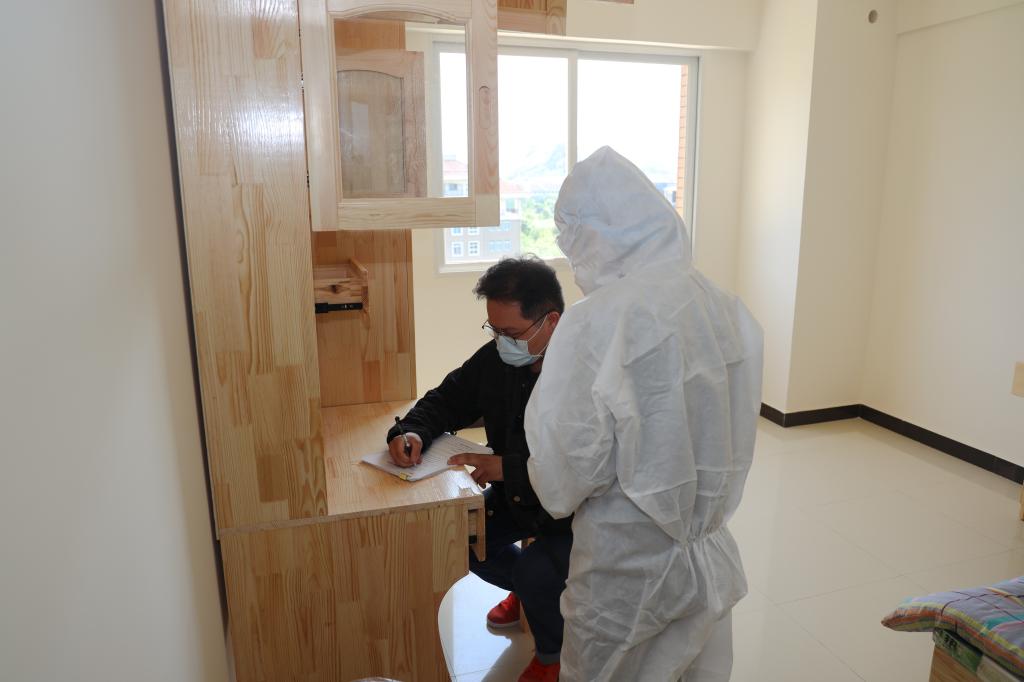 发热人员入住健康观察室演练在国际交流学院设置的隔离区域,演练发热人员入住健康观察室处置流程,专项人员根据分工做好学生信息登记、健康观察告知、环境消杀、送餐、学生家长告知工作。