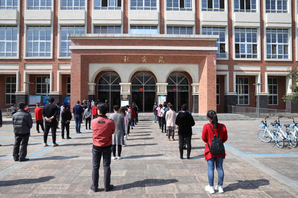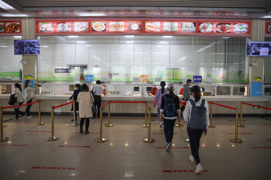 学生返校食堂错峰就餐演练在秋实苑餐厅,演练师生错峰就餐流程。演练食堂管理人员及志愿者有序引导师生、经专门入口鞋底消毒进入、间距1.2米排队领取食堂套餐、检测出体温异常学生处理以及消杀等工作。