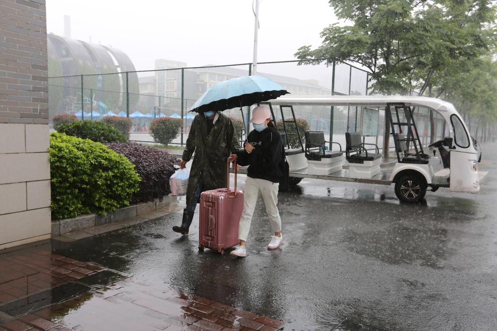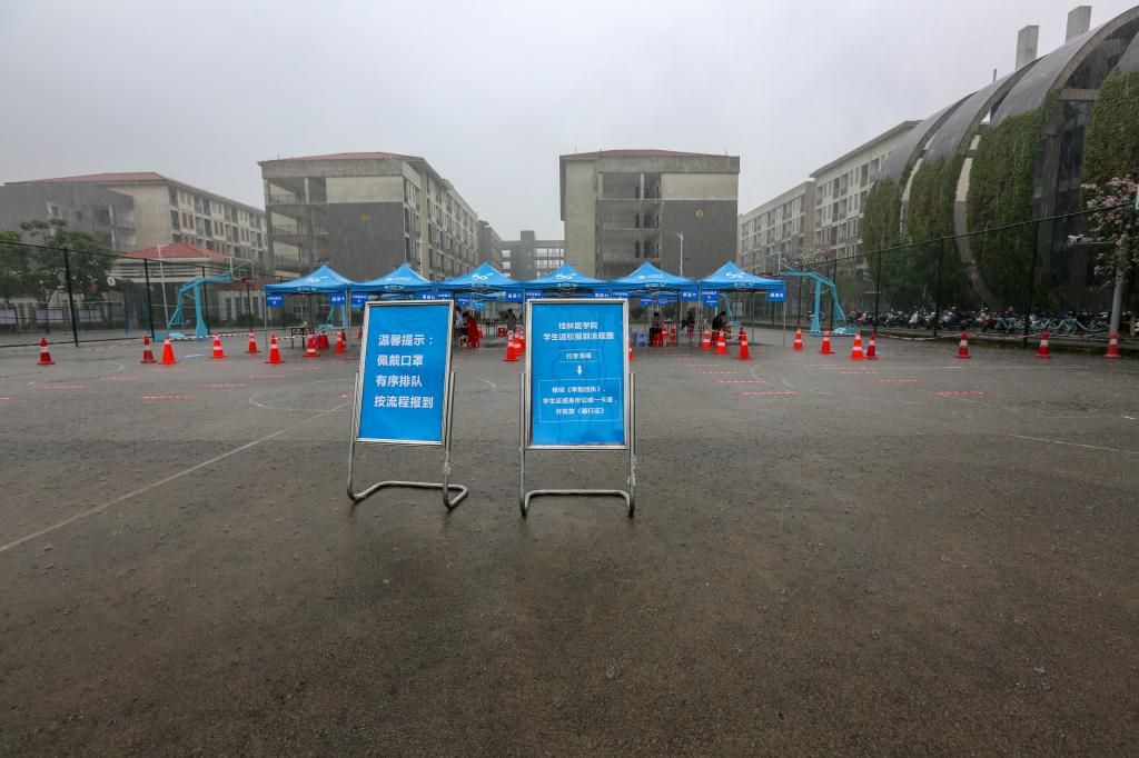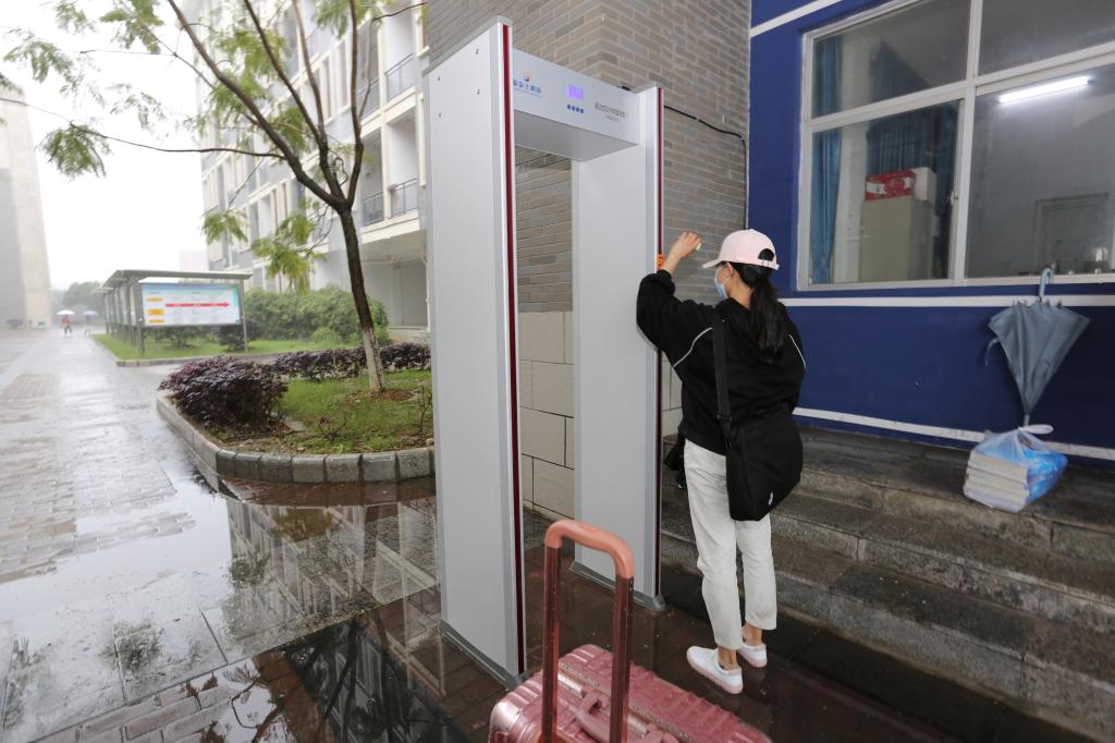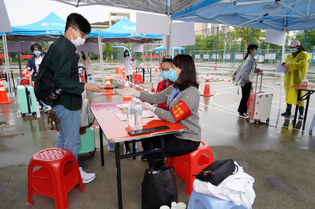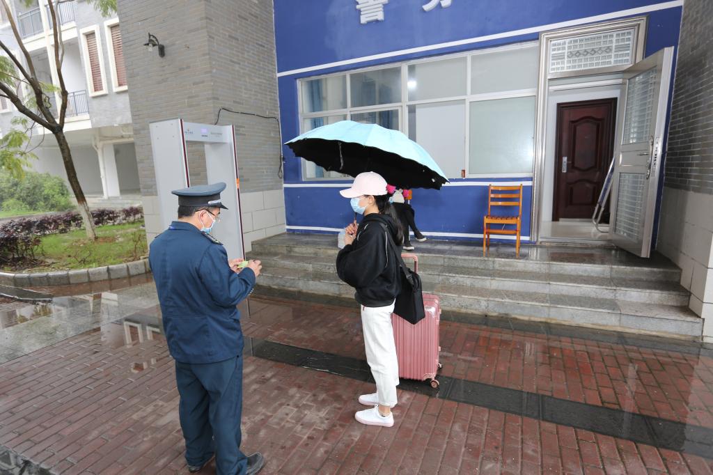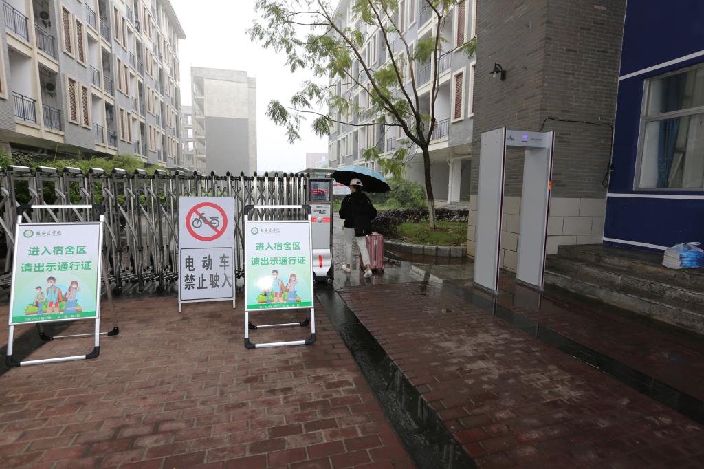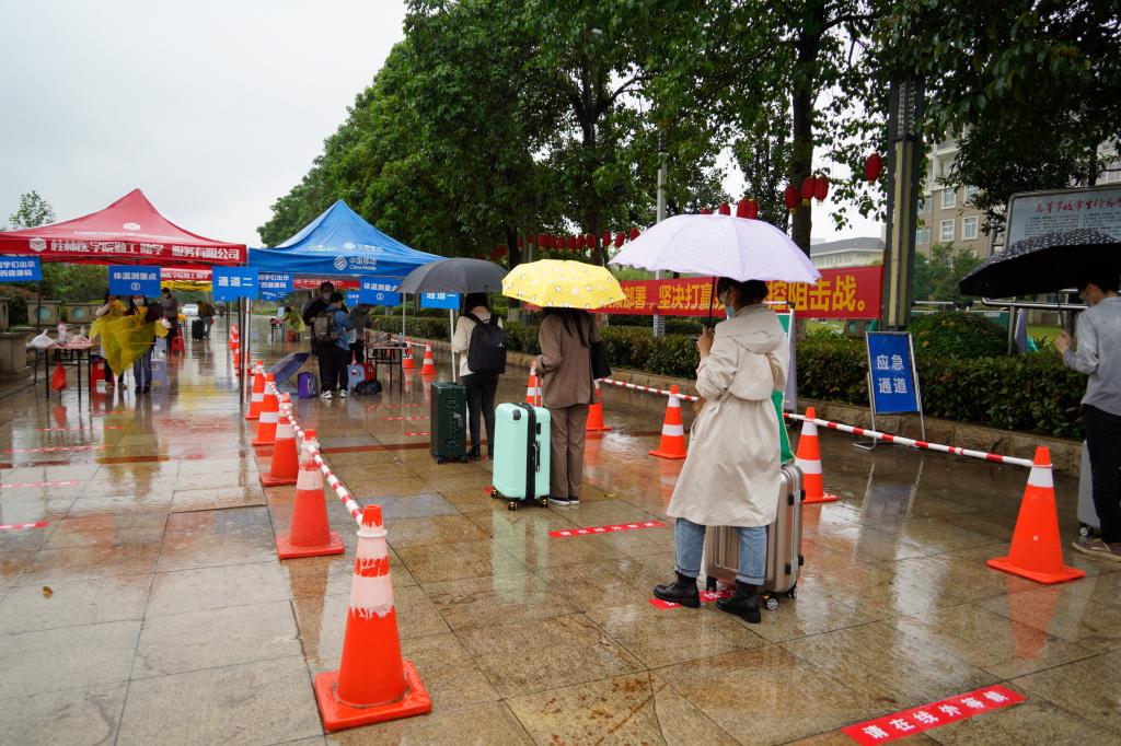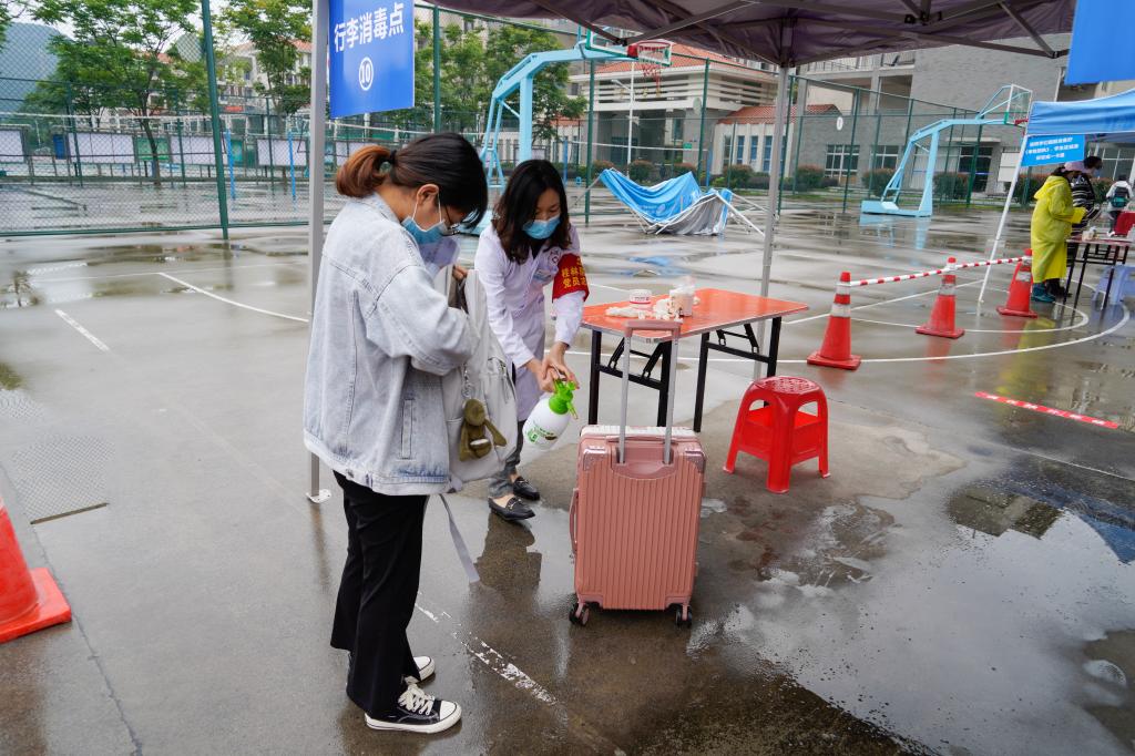 在学校报到检测区,返校学生由工作人员引导入校。学校提前确认了每个学生返校时间,学生事先填写返校回执单、申请健康绿码在现场出示,学生抵达后,经过测量体温、行李消杀、证件及健康码检验、信息登记、双手消毒等才能入校。