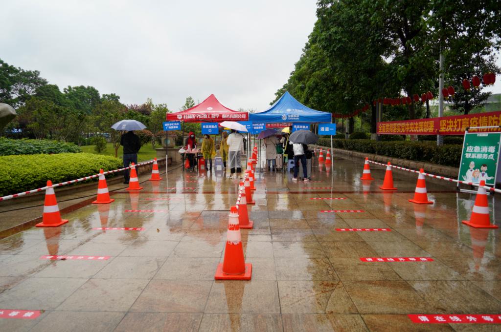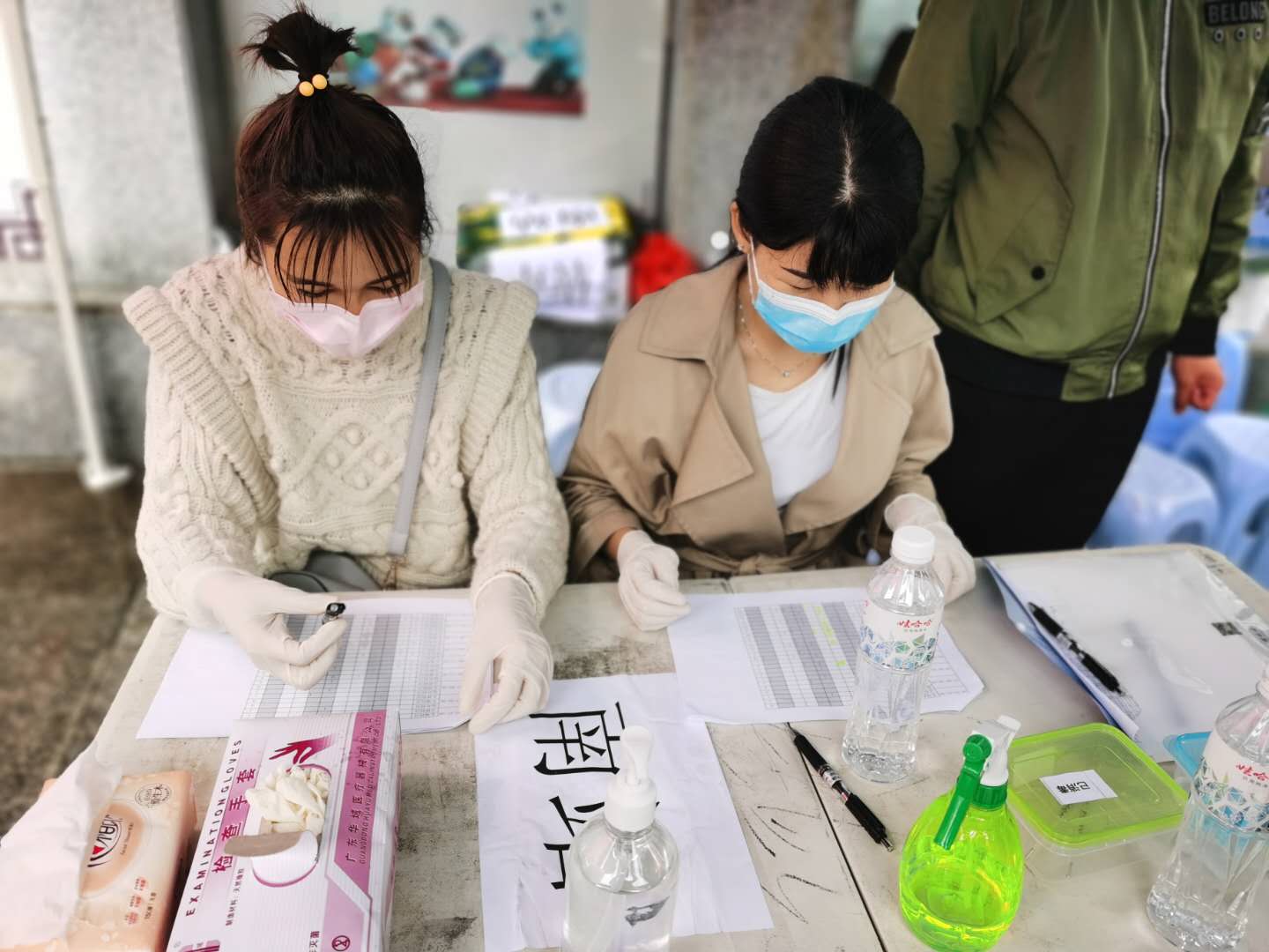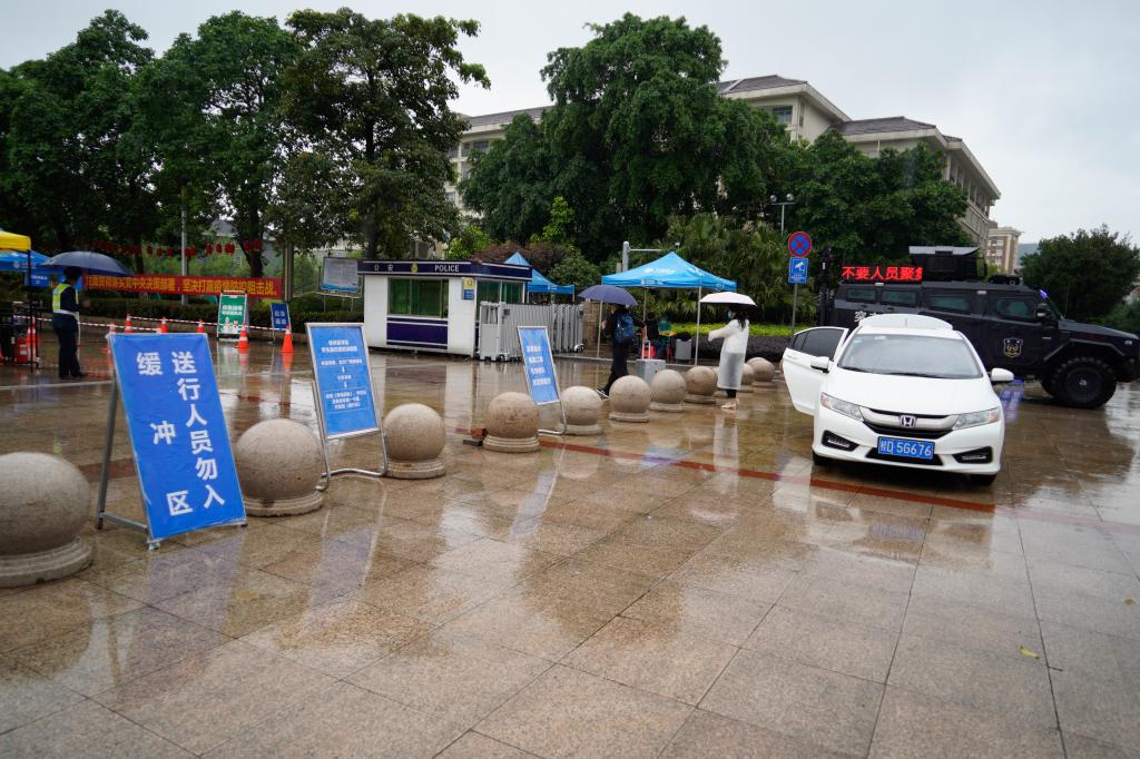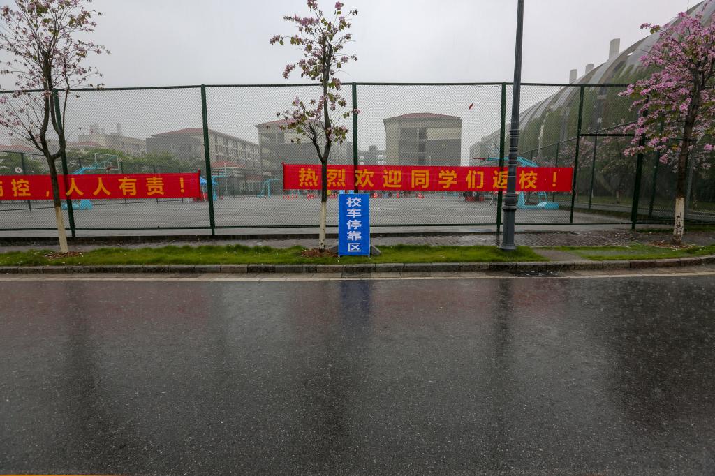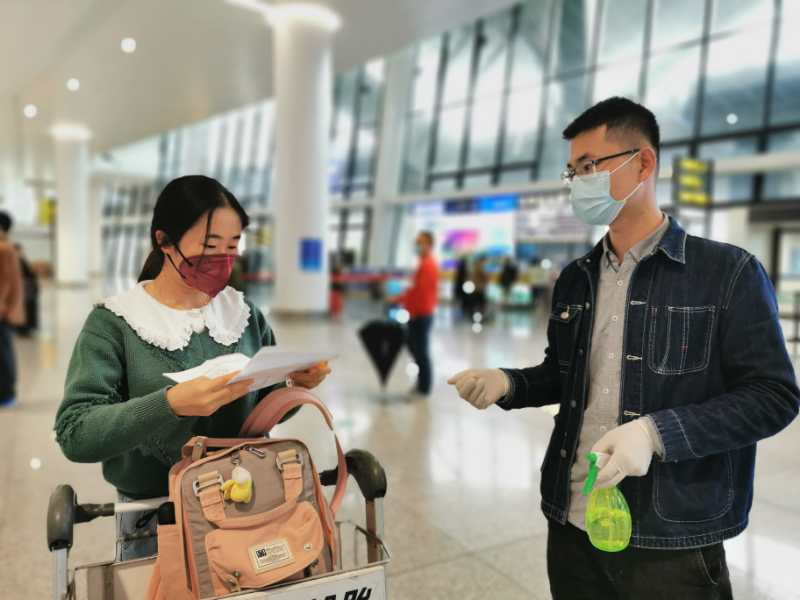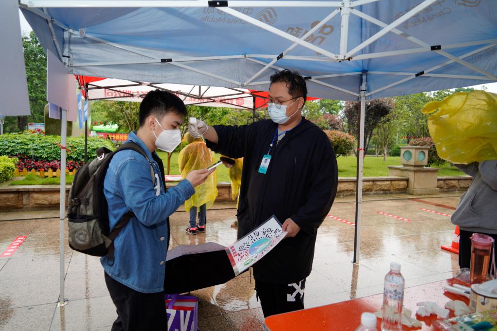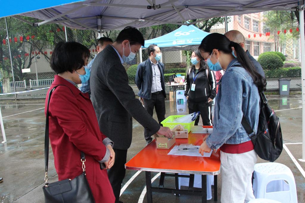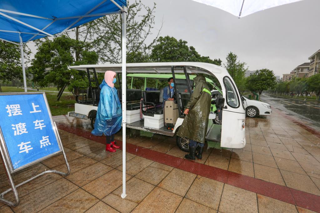 在学校报到检测区,返校学生由工作人员引导入校。学校提前确认了每个学生返校时间,学生事先填写返校回执单、申请健康绿码在现场出示,学生抵达后,经过测量体温、行李消杀、证件及健康码检验、信息登记、双手消毒等才能入校。