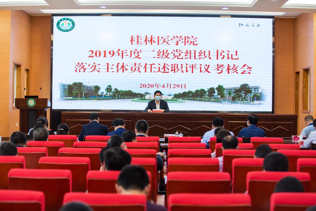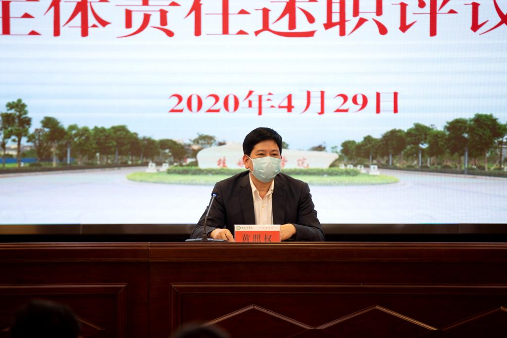 4月29日上午,我校二级党组织书记落实主体责任述职评议考核会在临桂校区明德楼101会议室召开。学校党政领导班子成员、院长助理出席会议,党委各职能部门负责人、各二级党组织书记、各二级学院行政负责人、党员代表和党外代表人士约60余人参加会议。会议由校党委书记黄照权主持。